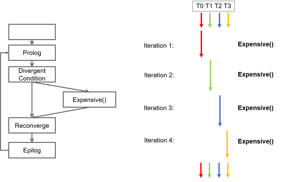 Speculative Reconvergence identifies serially executed common code blocks within divergent loops and modifies the compiler’s branch convergence mechanism to reconverge threads early, thereby maximizing parallelism within expensive code blocks at the cost of increased serialization along low-cost paths within a GPU program.
